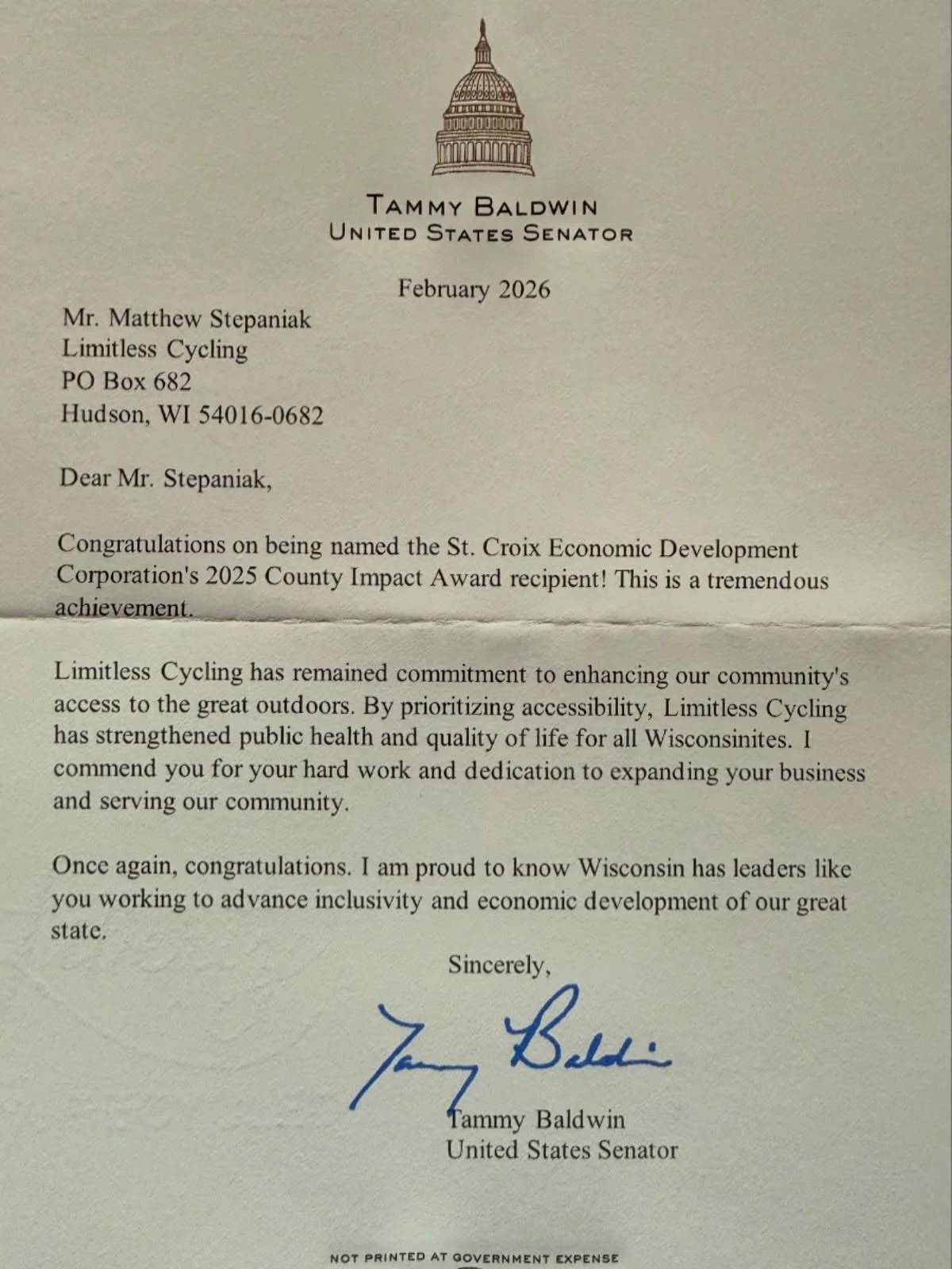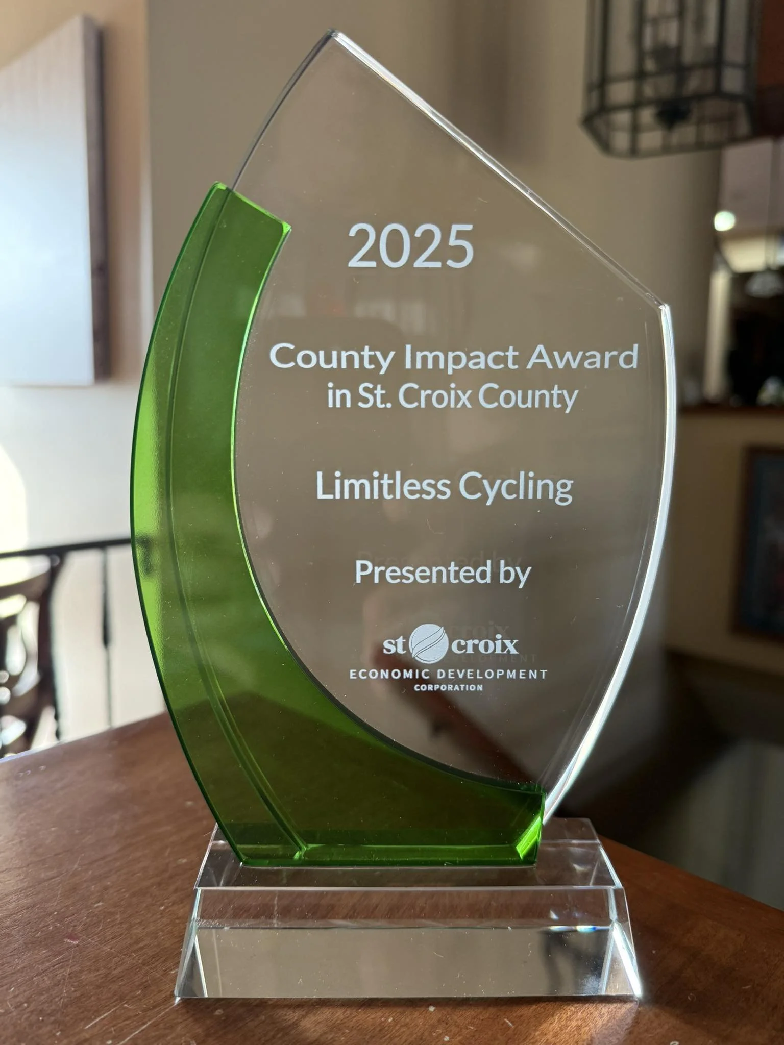 February 26, 2026: Limitless Cycling was awarded the St. Croix Economic Development Corporation’s 2025 County Impact Award of the Year.